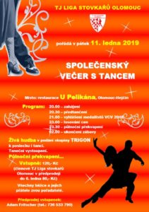 Datum zveřejnění: 5.12.2018TJ Liga stovkařů Olomouc pořádá každoročně (nejen) pro všechny běžce, kteří se účastní závodů Velké ceny vytrvalců Olomouckého kraje, tradiční Společenský večer s tancem. Ten se v příštím roce bude konat už v pátek 11. ledna od 20 hodin v osvědčeném sálku restaurace U Pelikána v Olomouci-Hejčíně. Vzhledem k tomu, že kapacita sálku je cca 120 míst a pro medailisty VCV je vyhrazeno 48 vstupenek, radíme zájemcům skutečně neotálet.